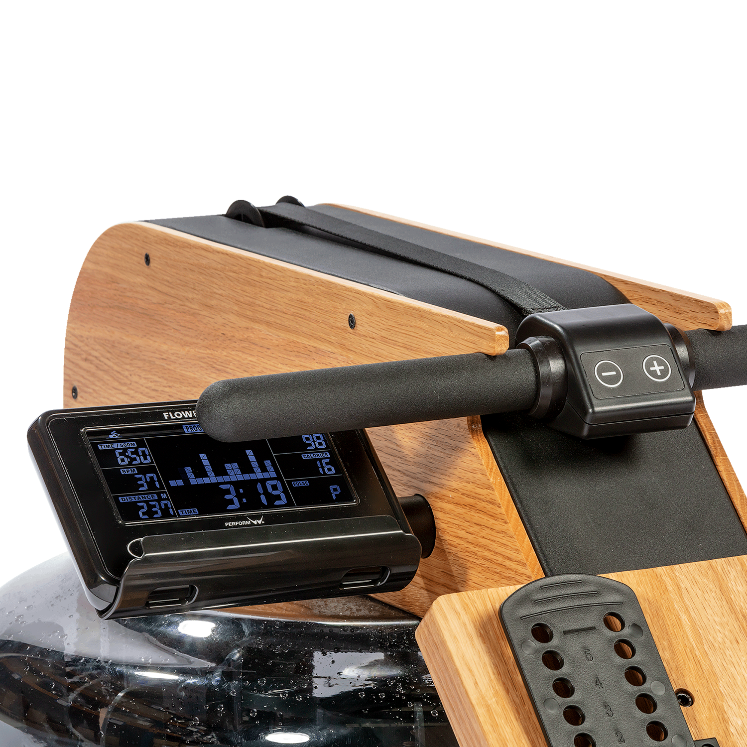 Flow Fitness Perform W9i er en avanceret vandromaskine i massivt egetræ, der kombinerer naturlig rofølelse, intelligent modstand og moderne app-integration. Det unikke vandmodstandssystem suppleres af justerbar friktionsmodstand, som nemt styres via Quick Keys i håndtaget. Resultatet er en jævn, realistisk og effektiv rooplevelse, der kan tilpasses alle niveauer – fra let konditionstræning til intensiv performance-træning.