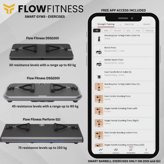 Med Flow Fitness DSG100i Smart Home Gym får du en kompakt, elegant og ekstremt alsidig alt-i-én styrketræningsløsning, der kan erstatte et helt fitnesscenter. Maskinen giver adgang til over 100 øvelser og passer perfekt til både begyndere og erfarne, uanset om målet er styrke, kondition, genoptræning eller fleksibilitet.