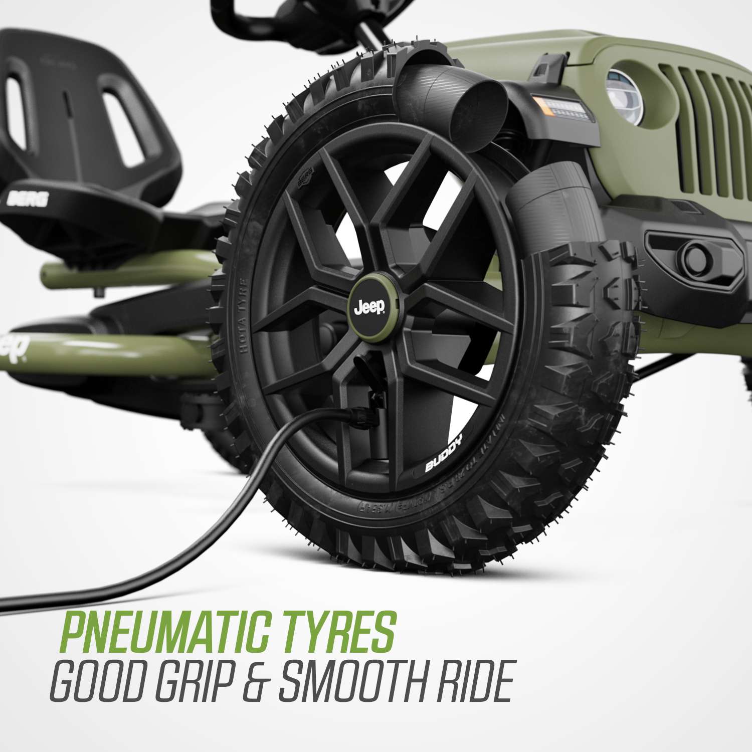 BERG Buddy er udstyret med pneumatiske luftdæk, som giver en ekstra jævn og behagelig køreoplevelse. Luftdækkene har lav rullemodstand, så det bliver lettere at træde i pedalerne – og det betyder, at barnet kan køre hurtigere med mindre anstrengelse.