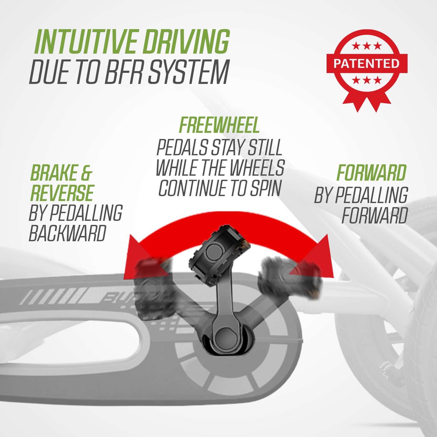 BERG Buddy er udstyret med det unikke BFR-system (Brake, Freewheel, Reverse), som giver en nem, sikker og sjov køreoplevelse. Systemet gør det muligt at bremse direkte med pedalerne, og når gokarten er stoppet, kan barnet bakke med det samme.