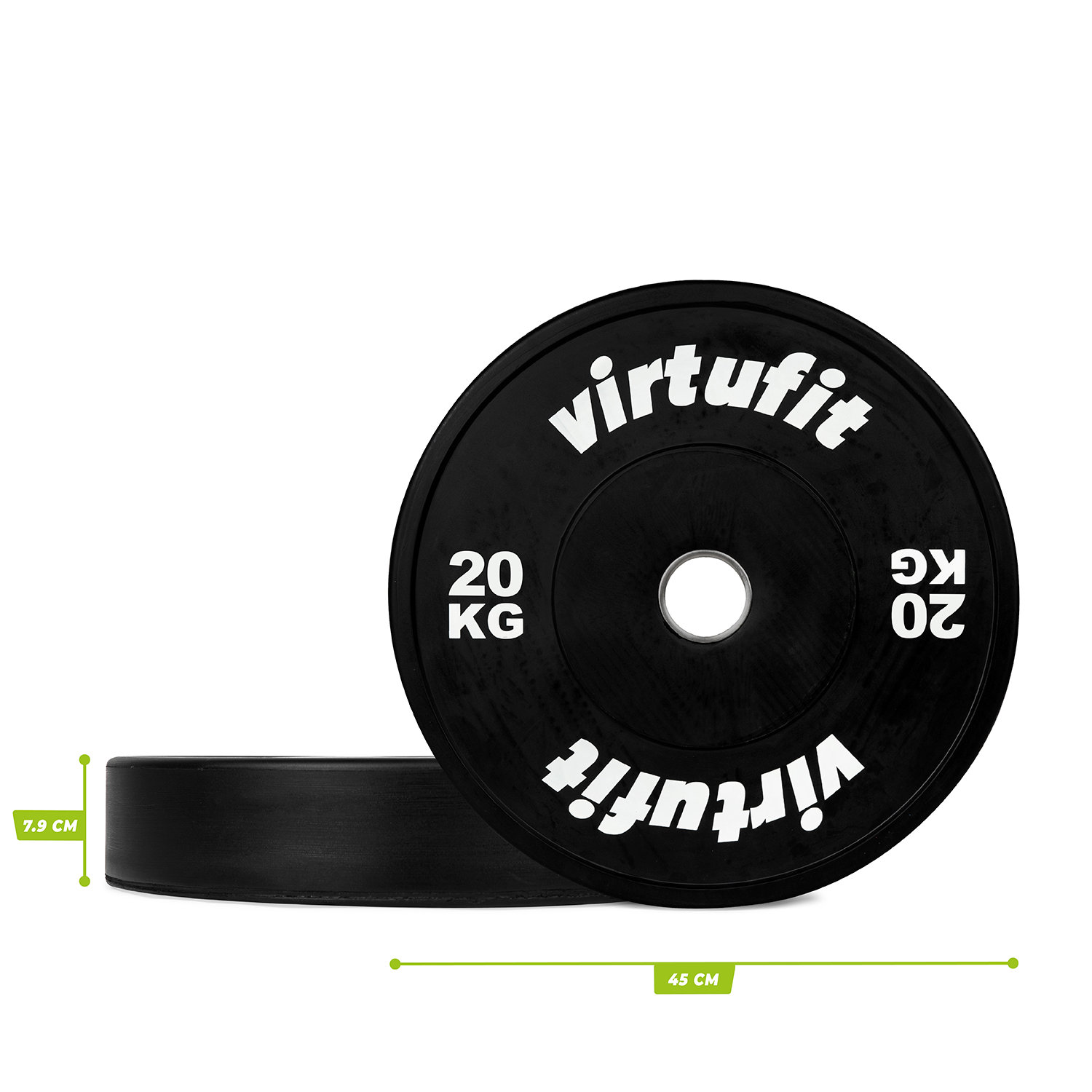 VirtuFit Bumper Plates er populære inden for både CrossFit og powerlifting, men de er også et fremragende valg til almindelig styrketræning – især hvis du vil træne mere skånsomt for gulv og udstyr. Skiverne er fremstillet i robust gummi, som reducerer støj ved nedslag og beskytter underlaget effektivt.
