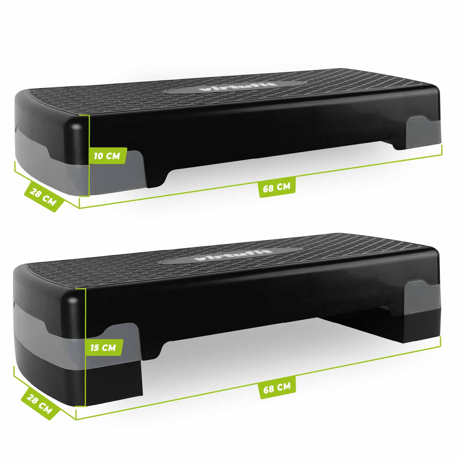 VirtuFit Essential Aerobic Step kan indstilles i to højder (10 eller 15 cm), så du nemt kan variere din træning og øge belastningen, når du bliver stærkere. For at mindske risikoen for skader anbefales det at starte lavt og gradvist øge højden.
