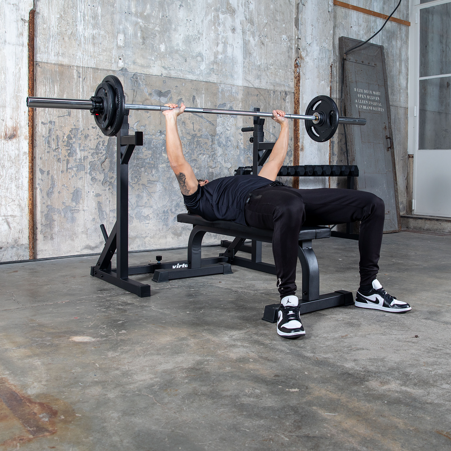 VirtuFit flad træningsbænk er ideel til bænkpres med håndvægte eller vægtstang. Træner du alene, anbefales håndvægte – eller kombiner bænken med vægtstang og spotter eller vægtstangsholdere for ekstra sikkerhed.