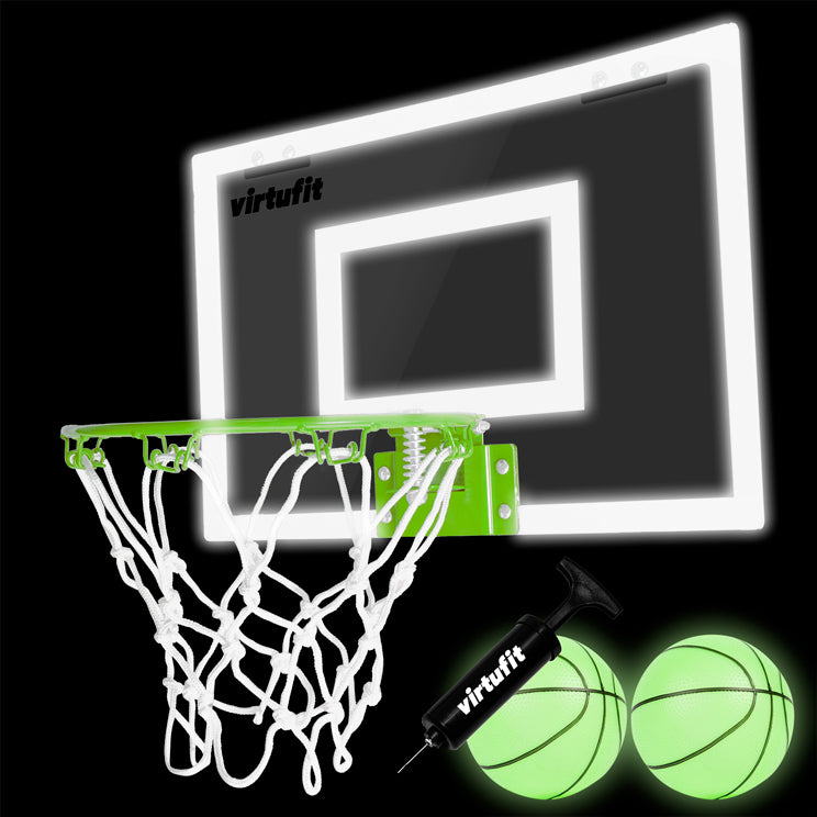 Har du lyst til at spille basketball derhjemme, på kontoret eller bare koble af i hverdagen? Med VirtuFit Mini Basketballkurv kan du nyde sjove og hurtige basketballkampe indendørs – helt uden at fylde meget. Den kompakte basketballkurv hænges nemt over døren og leveres komplet med 2 glow in the dark-bolde (Ø 14 cm) samt pumpe, så du kan komme i gang med det samme.