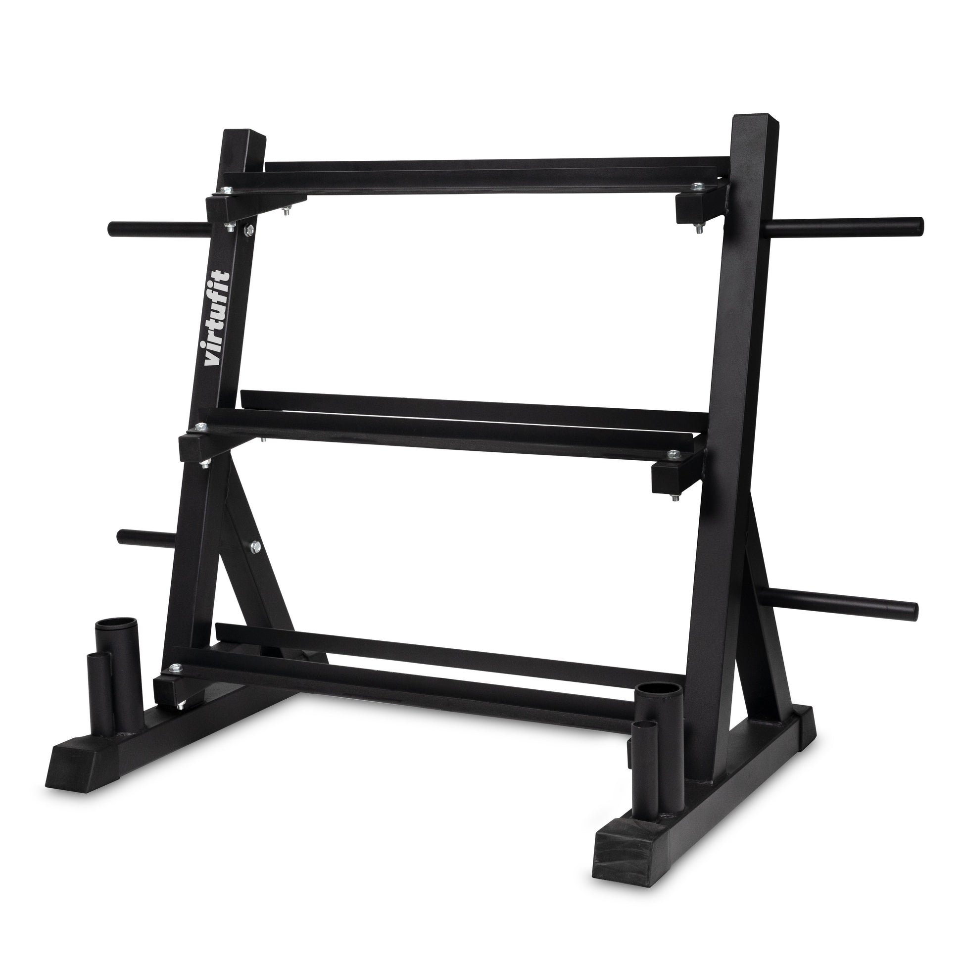 VirtuFit Multifunktionelt Opbevaringsstativ hjælper dig med at holde dit træningsområde pænt og effektivt indrettet. De tre rummelige hylder giver god plads til håndvægte i forskellige størrelser, mens de fire skiveholdere på siderne sikrer sikker og struktureret opbevaring af vægtskiver.